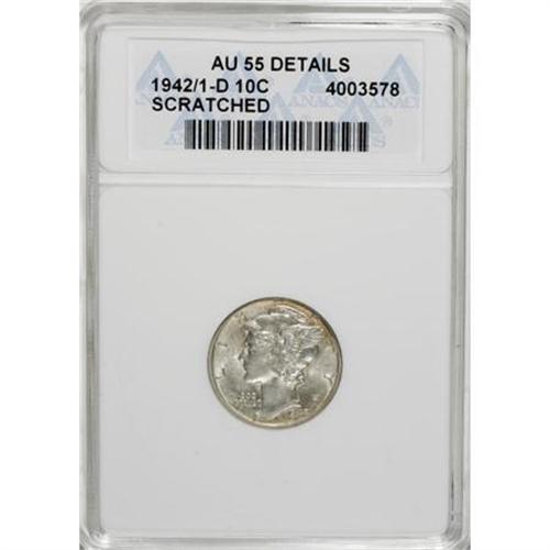 <B>1942/1-D 10C --Scratched--ANACS. AU55 Details.</B></I> Light gray surfaces retain ample luster, and exhibit sharply struck design elements, including middle bands that are nearly completely split. A couple of shallow, short scratches on the neck account for the ANACS disclaimer.<BR><BR><B>Coin Engraver:</B> Adolph A. Weinman<BR><BR><b>Shipping:</b> Coins & Currency (<a target="_blank" href="http://www.heritageauctions.com/common/shipping.php">view shipping information</a>)