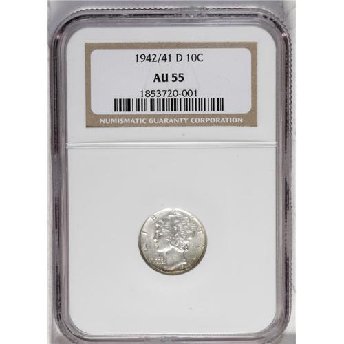 <B>1942/1-D 10C AU55 NGC.</B></I> An appealing, briefly circulated example of this popular overdate. Hints of golden-tan toning appear at the periphery, and a light fingerprint is noted near Weinman's initials. Census: 22 in 55, 39 finer (10/06).<BR><BR><b>Shipping:</b> Coin/Currency (<a target="_blank" href="http://www.heritageauctions.com/common/shipping.php">view shipping information</a>)