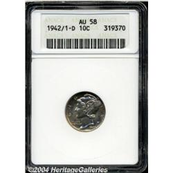 <B>1942/1-D<10C> AU58 ANACS.</B></I> The obverse is toned in moderate shades of amber and charcoal blue, the reverse is much lighter with a pastel-golden tint. The bands are still well defined despite the faint wear that is visible. This is one of the few overdate coins of the 20th century, always difficult to find, and popular with collectors for this reason. <BR><BR><B>Important notice:</B> Heritage usually auctions material at the rate of 200-250 lots per hour. On some occasions eBay Live bid software or the Internet may not be able to keep up with the pace of the auction. We recommend placing a realistic absentee bid now as insurance to avoid disappointment. Occasionally the auctioneer may eliminate or reject an eBay Live bid, and the auctioneer may also reopen a lot after the close of the eBay live bidding (usually because we missed an audience bid), and may reject your bid even if it shows you as the winning bidder. By bidding via eBay Live, you agree that Heritage may award the lot to another bidder at its sole discretion under the circumstances described above or any other reasonable circumstances. Since eBay bids are not shown to us until we open the lot on the floor, we treat those bids just like floor bids. In most cases the floor responds before the eBay bid is presented to us, due to Internet lag time, so for consistency we have made it a policy that floor bids are always considered first over tie eBay live bids. Also please note that all Heritage lots purchased through eBay Live carry a 20% Buyer's Premium. Please make sure you read the Terms and Conditions before you bid. </span></font></tr></table></td></tr></table>