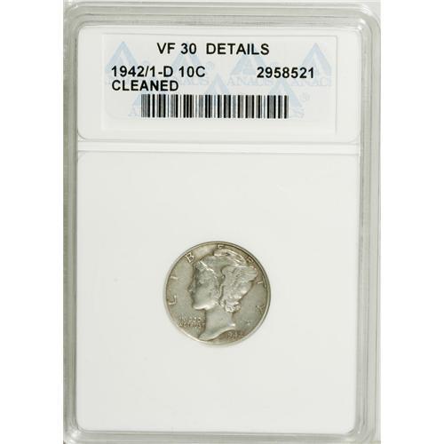 <B>1942/1-D 10C --Cleaned--ANACS. VF30 Details.</B></I> NGC Census: (128/344). PCGS Population (43/271). Mintage: 60,740,000. Numismedia Wsl. Price: $672. (#5040)<BR><BR><b>Shipping:</b> Coins & Currency (<a target="_blank" href="http://www.heritageauctions.com/common/shipping.php">view shipping information</a>)