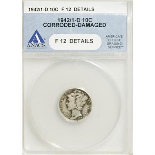 <B>1942/1-D 10C --Corroded, Damaged--ANACS. Fine 12 Details.</B></I> NGC Census: (23/414). PCGS Population (21/475). Mintage: 60,740,000. Numismedia Wsl. Price for NGC/PCGS coin in F12: $500. (#5040)<BR><BR><B>Coin Engraver:</B> Adolph A. Weinman<BR><BR><b>Shipping:</b> Coins & Currency (<a target="_blank" href="http://www.heritageauctions.com/common/shipping.php">view shipping information</a>)