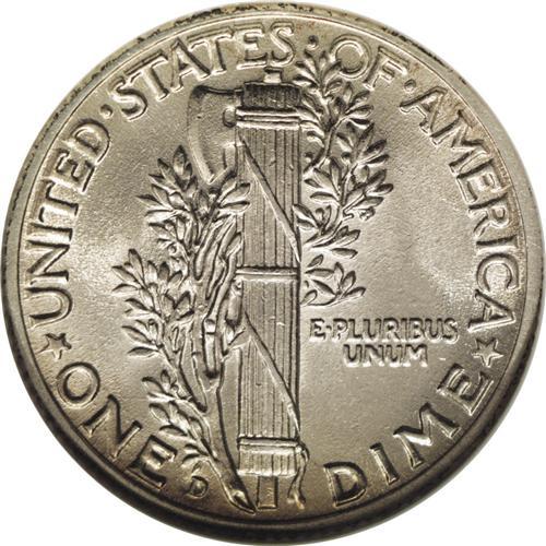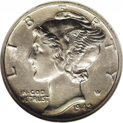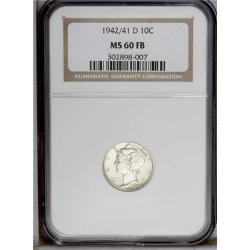 <B>1942/1-D<10C> MS60 Full Bands NGC.</B></I> FS-010.8. Bright and lustrous throughout, with no signs of toning on the fields are devices. Sharply impressed and appealing for the lustrous fields and clean surfaces. Moderate abrasions and faint hairlines apparently account for the modest grade. The overdate feature is as clear as ever, with the tail of the 1 showing beneath the 2, and portions of the post present within the loop of the 2. These have been included with the Mercury dime collections for a number of years and are one of the most difficult coins to acquire.
