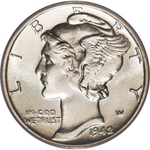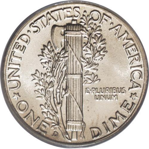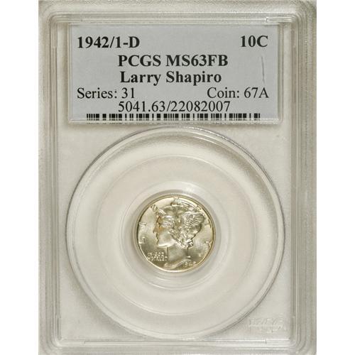 <B>1942/1-D 10C MS63 Full Bands PCGS.</B></I> Ex: Larry Shapiro More difficult to spot than its P-mint counterpart, the 1942/1-D variety first came to the attention of numismatists sometime in the early 1960s. Nonetheless, numerous Mint State examples survive. This satiny, untoned example shows both the overdate feature and the doubled IN GOD WE TRUST plainly. The strike is a bit soft on Liberty's highpoint hair, but the central reverse bands are fully split and fully rounded. Under a loupe, a light scrape appears on the bust truncation and on the lower diagonal, with a few miscellaneous reverse ticks. Population: 18 in 63, 56 finer (4/07).<BR><BR><b>Shipping:</b> Coins & Currency (<a target="_blank" href="http://www.heritageauctions.com/common/shipping.php">view shipping information</a>)