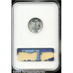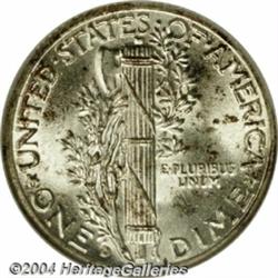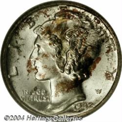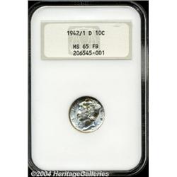 <B>1942/1-D<10C> MS65 Full Bands NGC.</B></I> The 1942/1-D, much rarer than its Philadelphia counterpart, is not valued as highly, because the underdigit is less visible, and because most standard albums do not require this issue. The D-mint overdate was not discovered until 1960, and was sporadically publicized over the next dozen years or so. According to Lange: "It wasn't until the early 1970s that this variety achieved a listing in the Red Book and became widely acknowledged. One can surmise that the considerable amount of time that passed between this variety's creation and its widespread popularity among collectors led to the majority of the coins acquiring wear from some length of time spent in circulation. Indeed, Lange opines that Mint State survivors are "especially" rare. The present specimen has exceptionally bright surfaces, covered by splashes of olive and russet toning on the obverse. The reverse shows just a few speckles of color. The design elements are sharply struck, with virtually no areas of softness. A few trivial marks on the fasces are not bothersome. Population: 6 in 65, 5 finer (7/04).<BR><I>From The Reed Hawn Collection of Mercury Dimes.</B></I> <BR><BR><B>Important notice:</B> Heritage usually auctions material at the rate of 200-250 lots per hour. On some occasions eBay Live bid software or the Internet may not be able to keep up with the pace of the auction. We recommend placing a realistic absentee bid now as insurance to avoid disappointment. Occasionally the auctioneer may eliminate or reject an eBay Live bid, and the auctioneer may also reopen a lot after the close of the eBay live bidding (usually because we missed an audience bid), and may reject your bid even if it shows you as the winning bidder. By bidding via eBay Live, you agree that Heritage may award the lot to another bidder at its sole discretion under the circumstances described above or any other reasonable circumstances. Since eBay bids are not shown to us until we open the lot on the floor, we treat those bids just like floor bids. In most cases the floor responds before the eBay bid is presented to us, due to Internet lag time, so for consistency we have made it a policy that floor bids are always considered first over tie eBay live bids. Also please note that all Heritage lots purchased through eBay Live carry a 20% Buyer's Premium. Please make sure you read the Terms and Conditions before you bid. </span></font></tr></table></td></tr></table>