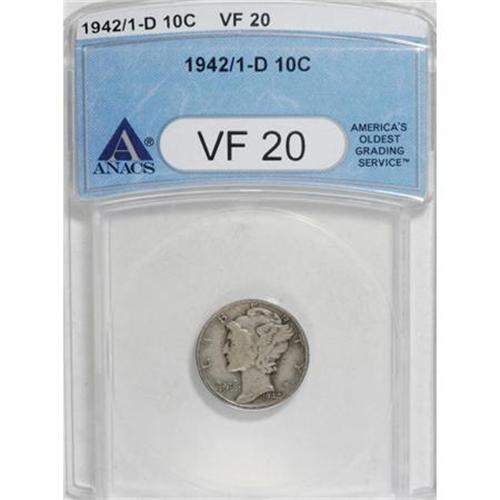 <B>1942/1-D 10C VF20 ANACS.</B></I> Little of the underlying 1 is visible, but the doubled 4 is diagnostic. Light gray surfaces are quite clean for the grade. A very nice example of this popular overdate.<BR><BR><b>Shipping:</b> Coins & Currency (<a target="_blank" href="http://www.heritageauctions.com/common/shipping.php">view shipping information</a>)