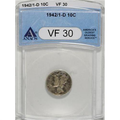 <B>1942/1-D 10C VF30 ANACS.</B></I> Golden-gray surfaces display bluish and violet accents, and retain sharp definition on the design elements. Both faces are quite clean for a coin that has seen light to moderate circulation.<BR><BR><B>Coin Engraver:</B> Adolph A. Weinman<BR><BR><b>Shipping:</b> Coins & Currency (<a target="_blank" href="http://www.heritageauctions.com/common/shipping.php">view shipping information</a>)