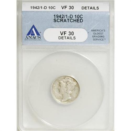 <B>1942/1-D 10C --Scratched--ANACS. VF30 Details.</B></I> . NGC Census: (51/285). PCGS Population (50/297). Mintage: 60,740,000. Numismedia Wsl. Price for NGC/PCGS coin in VF30: $672. (#5040)<BR><BR><B>Coin Engraver:</B> Adolph A. Weinman<BR><BR><b>Shipping:</b> Coins & Currency (<a target="_blank" href="http://www.heritageauctions.com/common/shipping.php">view shipping information</a>)