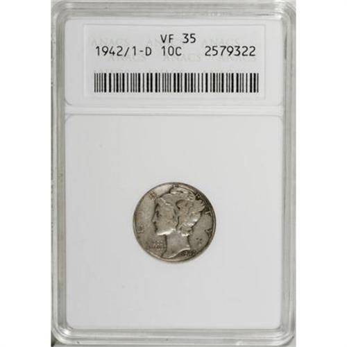 <B>1942/1-D 10C VF35 ANACS.</B></I> Though not as prominent as its P-mint overdate counterpart, the 1942/1-D commands a modest premium in most circulated grades. This attractive Choice VF piece shows pleasing definition for the assigned grade with few marks on its pearl-gray and charcoal surfaces.<BR><BR><B>Coin Engraver:</B> Adolph A. Weinman<BR><BR><b>Shipping:</b> Coins & Currency (<a target="_blank" href="http://www.heritageauctions.com/common/shipping.php">view shipping information</a>)