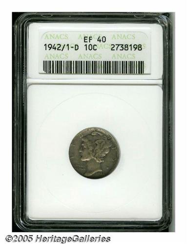 <B>1942/1-D<10C> XF40 ANACS.</B></I> Light wear is evident over the highpoints of this original coin. Medium gray toning covers most of each side with light colored accents.<BR><I>From The Empire State Collection, Part Two.</B></I>