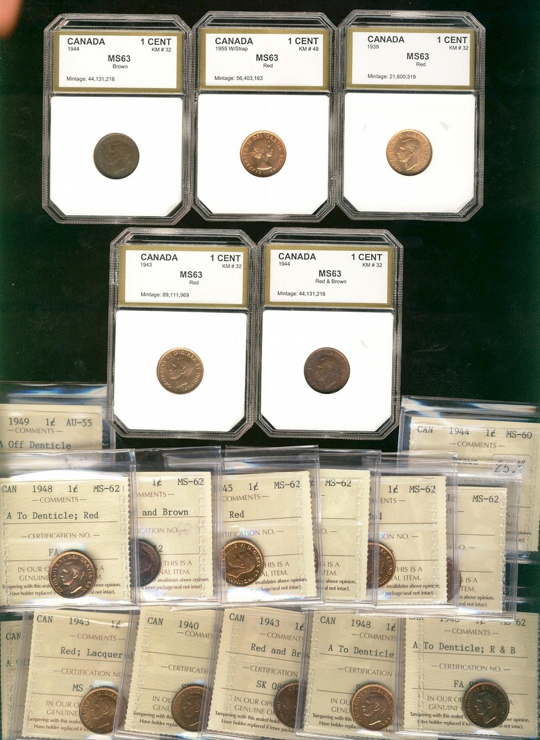 1942 1¢ MS62RB, 1945 MS62RD(3), 1946 MS62, 1948 A Off MS60RD, MS62RB, MS62RD, 1949 A Off AU55, MS62RB, 1944 MS60BN, 1940 AU55, 1943 MS63RD, 1943 MS63RB all ICCS graded and includes the following PCI graded examples, 1939, 1943, 1944(2) & 1955 SF all MS63. Lot includes 19 coins.