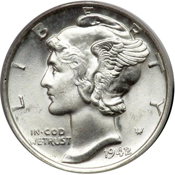 1942/1 Mercury Dime. PCGS graded MS-66. Well struck and fully white. The bands are almost full. Aside from the formidable 1916-D, the 1942/1 is the best known key issue in this series. The overdate is much bolder than the similarly rare 1942/1-D Mercury Dime. This famous variety was struck sometime near the end of 1941. The Philadelphia Mint was rushing to gear up to make dies for the 1942 production run. (Over 300 million Dimes were struck in 1942, the highest mintages of the denomination to that date.) Two obverse dies for the Mercury dime were impressed first with a 1941-dated hub, and then with a 1942-dated hub. One of these stayed in Philadelphia and was used to strike an unknown number of 1942/1 dimes. The other went to the Denver Mint. In the March 1943 Numismatic Scrapbook Magazine there was published a discovery article about the overdate submitted by Arnold Kohn of Kingston, New York. Despite the brief interval before this error was discovered, and the dash by collectors to find them, few coins have come down to today's specialists in elevated levels of preservation such as this lovely MS66 example. According to Walter Breen, most Uncirculated examples of this variety are from four rolls discovered in 1954.