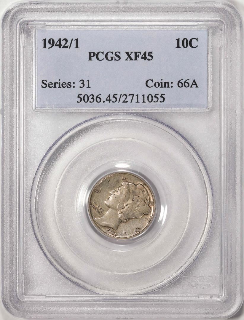 One 1942/1 Mercury Dime Coin PCGS XF45. PCGS Graded.