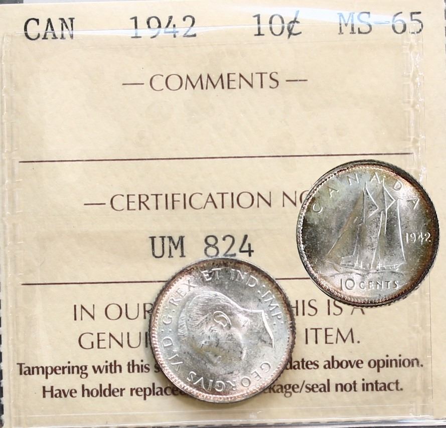 1942 10¢ ICCS Gem Mint State-65. Highly lustrous and attractive example.