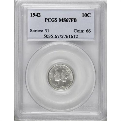 <B>1942 10C MS67 Full Bands PCGS.</B></I> PCGS Population (115/4). NGC Census: (205/1). Mintage: 205,432,336. Numismedia Wsl. Price for NGC/PCGS coin in MS67: $440. (#5035)<BR><BR><B>Coin Engraver:</B> Adolph A. Weinman<BR><BR><b>Shipping:</b> Coins & Currency (<a target="_blank" href="http://www.heritageauctions.com/common/shipping.php">view shipping information</a>)