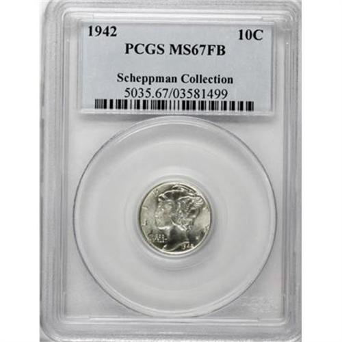 <B>1942 10C MS67 Full Bands PCGS.</B></I> Wonderful luster and an unimpeachable strike combine with subtle peach-inflected patina on this late-date Mercury dime. Incredibly appealing and nearly impossible to find any finer, with just four such coins graded by PCGS (12/07).<BR><I>From The Scheppman Collection, #4 PCGS Registry of Full Band Mercury Dimes.</B></I><BR><BR><B>Coin Engraver:</B> Adolph A. Weinman<BR><BR><b>Shipping:</b> Coins & Currency (<a target="_blank" href="http://www.heritageauctions.com/common/shipping.php">view shipping information</a>)