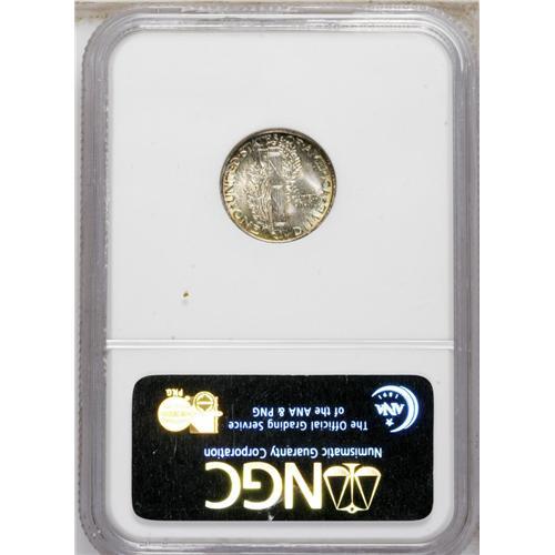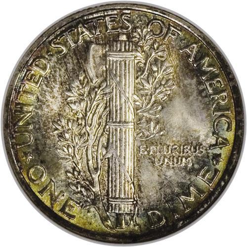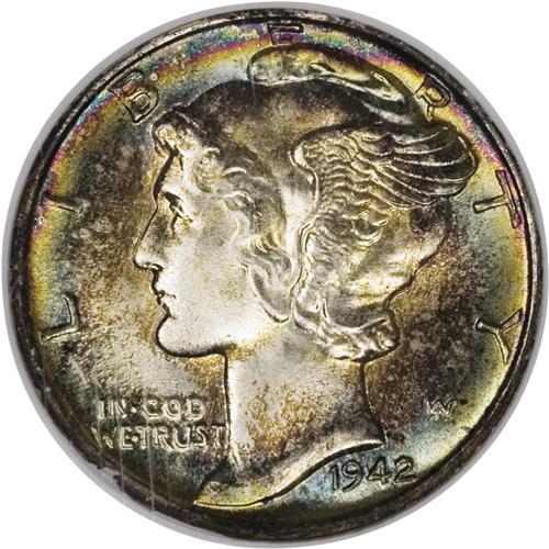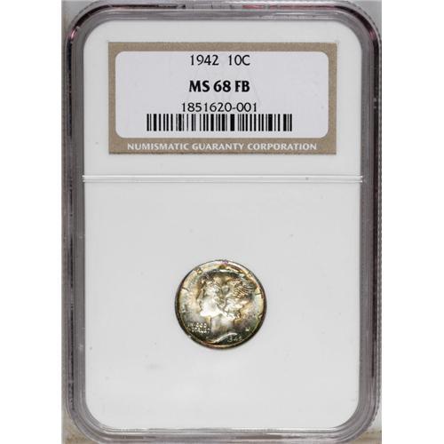<B>1942<10C> MS68 Full Bands NGC.</B></I> This beautiful coin combines a high degree of luster with vibrant peripheral toning, ranging from an almost cream color in the centers to rainbow bands of gold, russet, burgundy, and blue in the peripheries. As one might expect from the Superb grade, no surface markings are noted without a search under magnification. For pedigree purposes, there is a small tick on the lower diagonal cord on the reverse. Census data from NGC as of (7/06) shows one 1942 dime in 68 Full Bands with none finer; however, we sold an NGC-certified 1942 dime in this grade in our 2002 New York Signature Sale, and this does not appear to be the same coin. Regardless, the current piece brings an exemplary combination of technical excellence and eye appeal, and would fit comfortably in the finest Mercury dime collection.