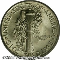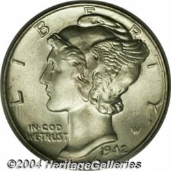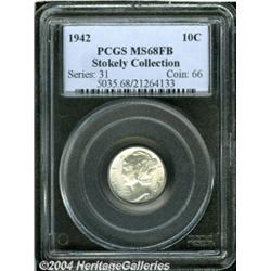 <B>1942<10C> MS68 Full Bands PCGS.</B></I> Ex: Stokely Collection. With a staggering original mintage of 205.4 million pieces, the 1942 is obviously a common date in an absolute sense. Few coins, however, have survived with surfaces as smooth as those of this lovely Superb Gem. In fact, NGC and PCGS combined have certified just three coins in MS68 Full Bands, and none finer (10/03). This is a silver-white example with bright mint luster and full, rounded central crossbands. Worthy of inclusion in the finest Mercury Dime collection. Population: 4 in 68, 0 finer (7/04). <BR><BR><B>Important notice:</B> Heritage usually auctions material at the rate of 200-250 lots per hour. On some occasions eBay Live bid software or the Internet may not be able to keep up with the pace of the auction. We recommend placing a realistic absentee bid now as insurance to avoid disappointment. Occasionally the auctioneer may eliminate or reject an eBay Live bid, and the auctioneer may also reopen a lot after the close of the eBay live bidding (usually because we missed an audience bid), and may reject your bid even if it shows you as the winning bidder. By bidding via eBay Live, you agree that Heritage may award the lot to another bidder at its sole discretion under the circumstances described above or any other reasonable circumstances. Since eBay bids are not shown to us until we open the lot on the floor, we treat those bids just like floor bids. In most cases the floor responds before the eBay bid is presented to us, due to Internet lag time, so for consistency we have made it a policy that floor bids are always considered first over tie eBay live bids. Also please note that all Heritage lots purchased through eBay Live carry a 20% Buyer's Premium. Please make sure you read the Terms and Conditions before you bid. </span></font></tr></table></td></tr></table>