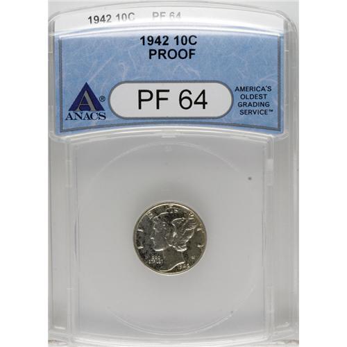 <B>1942 10C PR64 ANACS.</B></I> NGC Census: (872/5586). PCGS Population (1123/3650). Mintage: 22,329. Numismedia Wsl. Price for NGC/PCGS coin in PR64: $176. (#5077)<BR><BR><b>Shipping:</b> Coins & Currency (<a target="_blank" href="http://www.heritageauctions.com/common/shipping.php">view shipping information</a>)