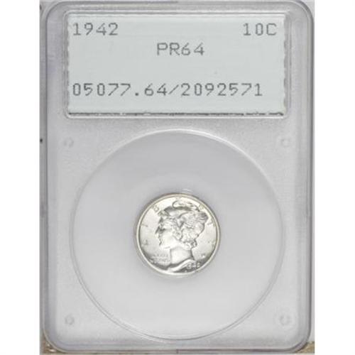 <B>1942 10C PR64 PCGS.</B></I> PCGS Population (1123/3679). NGC Census: (448/2958). Mintage: 22,329. Numismedia Wsl. Price for NGC/PCGS coin in PR64: $176. (#5077)<BR><BR><B>Coin Engraver:</B> Adolph A. Weinman<BR><BR><b>Shipping:</b> Coins & Currency (<a target="_blank" href="http://www.heritageauctions.com/common/shipping.php">view shipping information</a>)