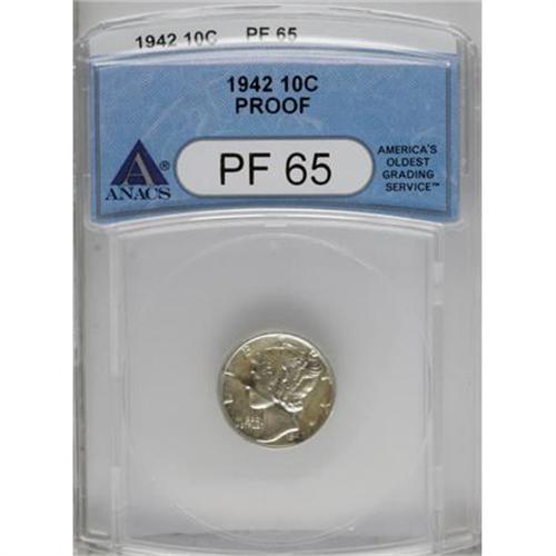 <B>1942 10C PR65 ANACS.</B></I> NGC Census: (863/1950). PCGS Population (1611/2043). Mintage: 22,329. Numismedia Wsl. Price for NGC/PCGS coin in PR65: $252. (#5077)<BR><BR><B>Coin Engraver:</B> Adolph A. Weinman<BR><BR><b>Shipping:</b> Coins & Currency (<a target="_blank" href="http://www.heritageauctions.com/common/shipping.php">view shipping information</a>\)