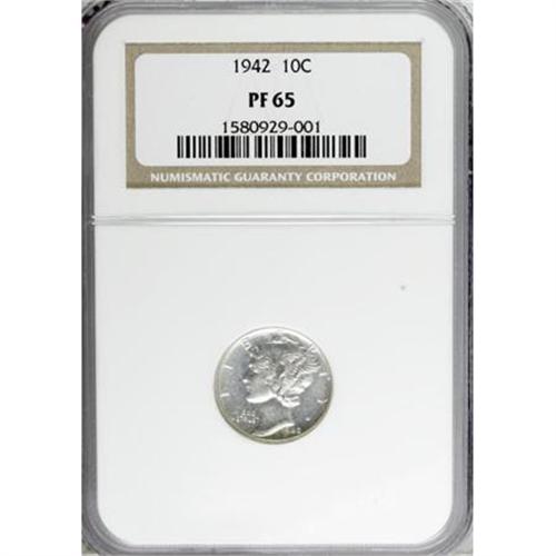 <B>1942 10C PR65 NGC.</B></I> NGC Census: (863/1950). PCGS Population (1611/2043). Mintage: 22,329. Numismedia Wsl. Price for NGC/PCGS coin in PR65: $252. (#5077)<BR><BR><B>Coin Engraver:</B> Adolph A. Weinman<BR><BR><b>Shipping:</b> Coins & Currency (<a target="_blank" href="http://www.heritageauctions.com/common/shipping.php">view shipping information</a>\)