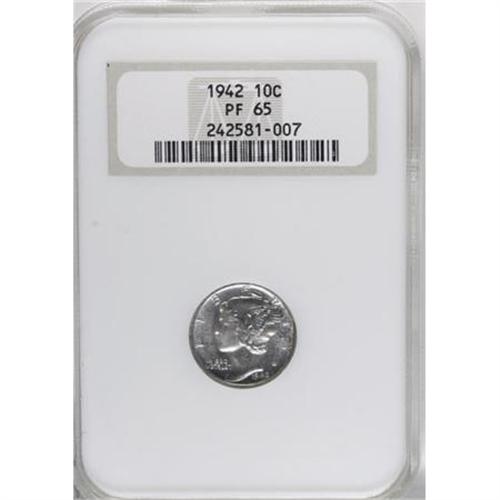<B>1942 10C PR65 NGC.</B></I> NGC Census: (864/1952). PCGS Population (1605/2050). Mintage: 22,329. Numismedia Wsl. Price for NGC/PCGS coin in PR65: $252. (#5077)<BR><BR><B>Coin Engraver:</B> Adolph A. Weinman<BR><BR><b>Shipping:</b> Coins & Currency (<a target="_blank" href="http://www.heritageauctions.com/common/shipping.php">view shipping information</a>)