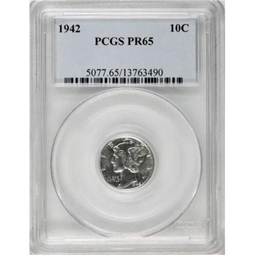 <B>1942 10C PR65 PCGS.</B></I> PCGS Population (1621/2089). NGC Census: (888/2081). Mintage: 22,329. Numismedia Wsl. Price for NGC/PCGS coin in PR65: $235. (#5077)<BR><BR><B>Coin Engraver:</B> Adolph A. Weinman<BR><BR><b>Shipping:</b> Coins & Currency (<a target="_blank" href="http://www.heritageauctions.com/common/shipping.php">view shipping information</a>)