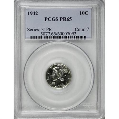 <B>1942 10C PR65 PCGS.</B></I> PCGS Population (1621/2089). NGC Census: (888/2081). Mintage: 22,329. Numismedia Wsl. Price for NGC/PCGS coin in PR65: $235. (#5077)<BR><BR><B>Coin Engraver:</B> Adolph A. Weinman<BR><BR><b>Shipping:</b> Coins & Currency (<a target="_blank" href="http://www.heritageauctions.com/common/shipping.php">view shipping information</a>)