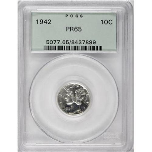 <B>1942 10C PR65 PCGS.</B></I> PCGS Population (1627/2100). NGC Census: (886/2089). Mintage: 22,329. Numismedia Wsl. Price for NGC/PCGS coin in PR65: $235. (#5077)<BR><BR><B>Coin Engraver:</B> Adolph A. Weinman<BR><BR><b>Shipping:</b> Coins & Currency (<a target="_blank" href="http://www.heritageauctions.com/common/shipping.php">view shipping information</a>)