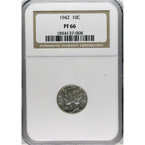 <B>1942 10C PR66 NGC.</B></I> NGC Census: (2556/1312). PCGS Population (1439/603). Mintage: 22,329. Numismedia Wsl. Price for NGC/PCGS coin in PR66: $296. (#5077)<BR><BR><b>Shipping:</b> Coins & Currency (<a target="_blank" href="http://www.heritageauctions.com/common/shipping.php">view shipping information</a>)