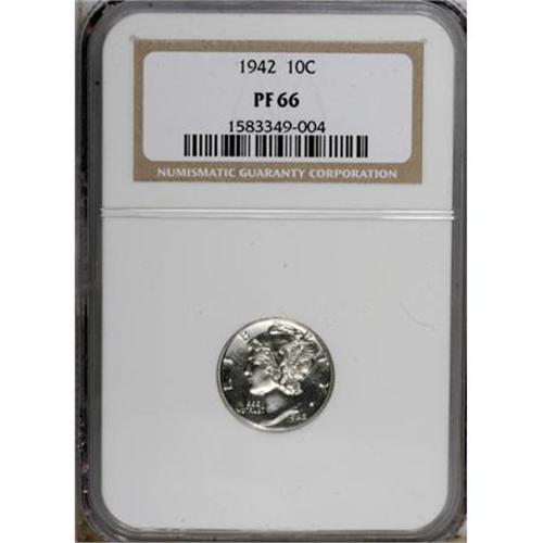 <B>1942 10C PR66 NGC.</B></I> NGC Census: (1291/661). PCGS Population (1443/605). Mintage: 22,329. Numismedia Wsl. Price for NGC/PCGS coin in PR66: $292. (#5077)<BR><BR><B>Coin Engraver:</B> Adolph A. Weinman<BR><BR><b>Shipping:</b> Coins & Currency (<a target="_blank" href="http://www.heritageauctions.com/common/shipping.php">view shipping information</a>)