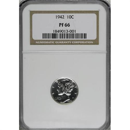 <B>1942 10C PR66 NGC.</B></I> NGC Census: (1291/661). PCGS Population (1443/605). Mintage: 22,329. Numismedia Wsl. Price for NGC/PCGS coin in PR66: $292. (#5077)<BR><BR><B>Coin Engraver:</B> Adolph A. Weinman<BR><BR><b>Shipping:</b> Coins & Currency (<a target="_blank" href="http://www.heritageauctions.com/common/shipping.php">view shipping information</a>)