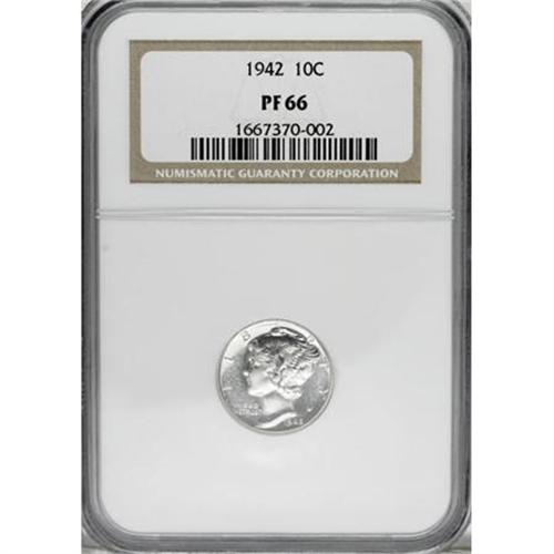 <B>1942 10C PR66 NGC.</B></I> NGC Census: (1342/733). PCGS Population (1451/613). Mintage: 22,329. Numismedia Wsl. Price for NGC/PCGS coin in PR66: $292. (#5077)<BR><BR><B>Coin Engraver:</B> Adolph A. Weinman<BR><BR><b>Shipping:</b> Coins & Currency (<a target="_blank" href="http://www.heritageauctions.com/common/shipping.php">view shipping information</a>)