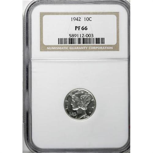 <B>1942 10C PR66 NGC.</B></I> . NGC Census: (1344/737). PCGS Population (1456/615). Mintage: 22,329. Numismedia Wsl. Price for NGC/PCGS coin in PR66: $280. (#5077)<BR><BR><B>Coin Engraver:</B> Adolph A. Weinman<BR><BR><b>Shipping:</b> Coins & Currency (<a target="_blank" href="http://www.heritageauctions.com/common/shipping.php">view shipping information</a>)