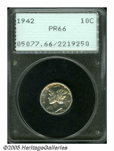 <B>1942<10C> PR66 PCGS.</B></I> Apricot color graces the borders of this needle-sharp and pristine premium Gem. The demands placed on the Philadelphia Mint by World War II ended proof production of the series. Certified in a first generation, small sized holder.