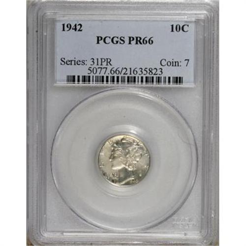 <B>1942 10C PR66 PCGS.</B></I> PCGS Population (1443/605). NGC Census: (1291/661). Mintage: 22,329. Numismedia Wsl. Price for NGC/PCGS coin in PR66: $292. (#5077)<BR><BR><B>Coin Engraver:</B> Adolph A. Weinman<BR><BR><b>Shipping:</b> Coins & Currency (<a target="_blank" href="http://www.heritageauctions.com/common/shipping.php">view shipping information</a>)
