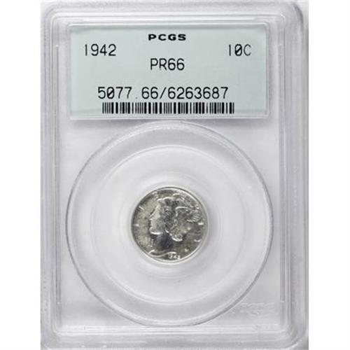 <B>1942 10C PR66 PCGS.</B></I> PCGS Population (1461/619). NGC Census: (1344/737). Mintage: 22,329. Numismedia Wsl. Price for NGC/PCGS coin in PR66: $280. (#5077)<BR><BR><B>Coin Engraver:</B> Adolph A. Weinman<BR><BR><b>Shipping:</b> Coins & Currency (<a target="_blank" href="http://www.heritageauctions.com/common/shipping.php">view shipping information</a>)