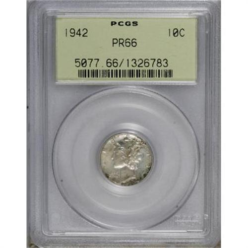 <B>1942 10C PR66 PCGS.</B></I> PCGS Population (1467/622). NGC Census: (1343/738). Mintage: 22,329. Numismedia Wsl. Price for NGC/PCGS coin in PR66: $280. (#5077)<BR><BR><B>Coin Engraver:</B> Adolph A. Weinman<BR><BR><b>Shipping:</b> Coins & Currency (<a target="_blank" href="http://www.heritageauctions.com/common/shipping.php">view shipping information</a>)