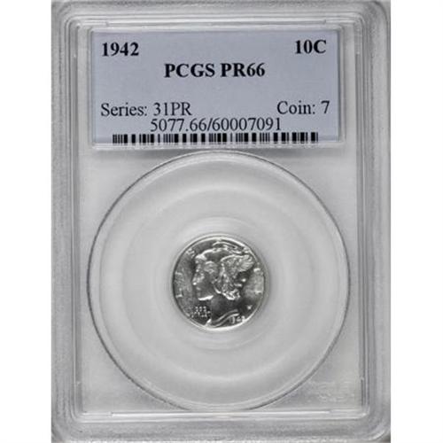 <B>1942 10C PR66 PCGS.</B></I> PCGS Population (1467/622). NGC Census: (1343/738). Mintage: 22,329. Numismedia Wsl. Price for NGC/PCGS coin in PR66: $280. (#5077)<BR><BR><B>Coin Engraver:</B> Adolph A. Weinman<BR><BR><b>Shipping:</b> Coins & Currency (<a target="_blank" href="http://www.heritageauctions.com/common/shipping.php">view shipping information</a>)