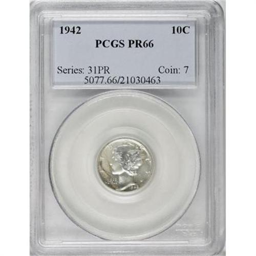 <B>1942 10C PR66 PCGS.</B></I> PCGS Population (1472/628). NGC Census: (1347/742). Mintage: 22,329. Numismedia Wsl. Price for NGC/PCGS coin in PR66: $280. (#5077)<BR><BR><B>Coin Engraver:</B> Adolph A. Weinman<BR><BR><b>Shipping:</b> Coins & Currency (<a target="_blank" href="http://www.heritageauctions.com/common/shipping.php">view shipping information</a>)