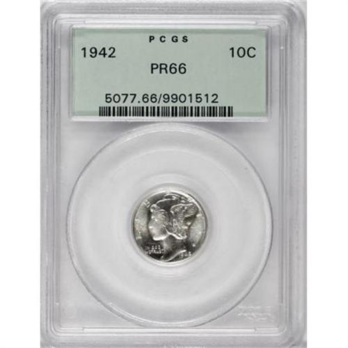 <B>1942 10C PR66 PCGS.</B></I> PCGS Population (1472/628). NGC Census: (1347/742). Mintage: 22,329. Numismedia Wsl. Price for NGC/PCGS coin in PR66: $280. (#5077)<BR><BR><B>Coin Engraver:</B> Adolph A. Weinman<BR><BR><b>Shipping:</b> Coins & Currency (<a target="_blank" href="http://www.heritageauctions.com/common/shipping.php">view shipping information</a>)