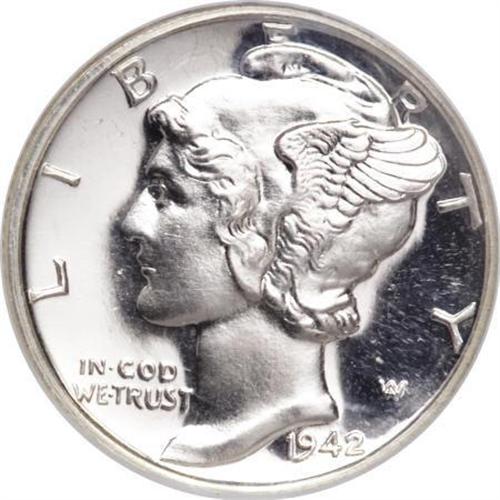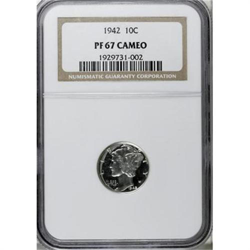 <B>1942 10C PR67 Cameo NGC.</B></I> For some reason the proofs from 1936 through 1942 are almost never located with cameo contrast. The few that are known appear to have been struck from new dies, before the frost wore away from repeated strikings. This is one of those few. The surfaces are brilliant throughout. The devices are lightly but noticeably frosted with deeply reflective fields. Census: 2 in 67 Cameo, 0 finer (1/08).<BR><BR><b>Shipping:</b> Coins & Currency (<a target="_blank" href="http://www.heritageauctions.com/common/shipping.php">view shipping information</a>)