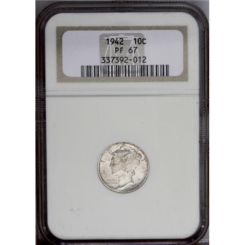 <B>1942<10C> PR67 NGC.</B></I> Bright surfaces are visited by streaks of gold-tan patina, most notably on the obverse. The design elements are exquisitely struck, and both sides are well preserved.