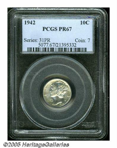 <B>1942<10C> PR67 PCGS.</B></I> Glimpses of obverse peach color deny full brilliance. Exactingly struck and immaculate, this final year proof Mercury Dime is a worthy contribution to a proof type set.