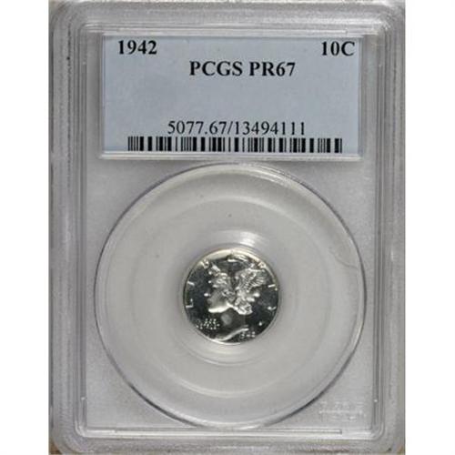 <B>1942 10C PR67 PCGS.</B></I> A brilliant, sparkling Superb Gem with highly reflective fields and immaculately preserved surfaces. The striking details are razor-sharp, as slight clockwise reverse die rotation is noted. A beautiful and seemingly unimprovable example of this final proof Mercury dime issue. <BR><BR><B>Coin Engraver:</B> Adolph A. Weinman<BR><BR><b>Shipping:</b> Coins & Currency (<a target="_blank" href="http://www.heritageauctions.com/common/shipping.php">view shipping information</a>)