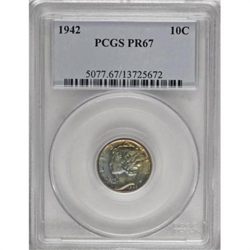 <B>1942 10C PR67 PCGS.</B></I> This amazing Superb Gem dime is sure to impress the toning enthusiast. On both sides, luminous yellow-green peripheral toning cedes to deep blues, violets, and the occasional hint of mauve. A strongly reflective, wonderful specimen from the final proof Mercury dime issue. PCGS has graded a mere 37 pieces finer (10/07).<BR><BR><B>Coin Engraver:</B> Adolph A. Weinman<BR><BR><b>Shipping:</b> Coins & Currency (<a target="_blank" href="http://www.heritageauctions.com/common/shipping.php">view shipping information</a>)