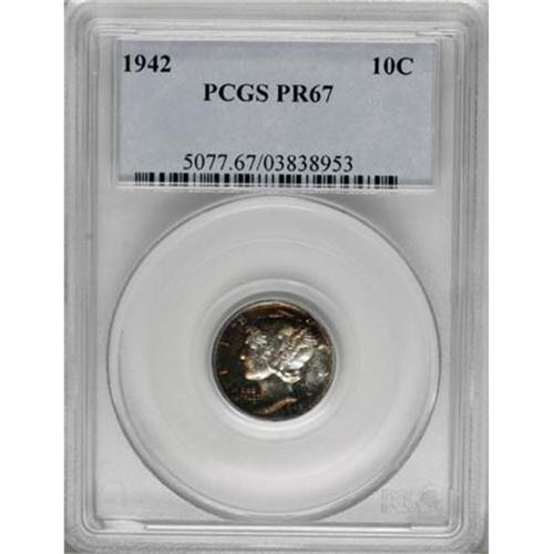 <B>1942 10C PR67 PCGS.</B></I> PCGS Population (578/37). NGC Census: (634/99). Mintage: 22,329. Numismedia Wsl. Price for NGC/PCGS coin in PR67: $448. (#5077)<BR><BR><B>Coin Engraver:</B> Adolph A. Weinman<BR><BR><b>Shipping:</b> Coins & Currency (<a target="_blank" href="http://www.heritageauctions.com/common/shipping.php">view shipping information</a>)