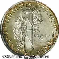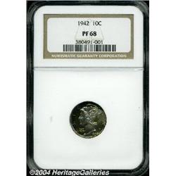 <B>1942<10C> PR68 NGC.</B></I> A crescent of iridescent sky-blue, turquoise, violet, crimson, and gold-orange occupies the left obverse border, and a smaller splash is found in the lower right obverse field. A band of similar coloration, only dominated by orange-gold, gravitates to the reverse margins. The bright surfaces are on the margins of technical perfection. A simply spectacular Superb Gem proof Mercury! <BR><BR><B>Important notice:</B> Heritage usually auctions material at the rate of 200-250 lots per hour. On some occasions eBay Live bid software or the Internet may not be able to keep up with the pace of the auction. We recommend placing a realistic absentee bid now as insurance to avoid disappointment. Occasionally the auctioneer may eliminate or reject an eBay Live bid, and the auctioneer may also reopen a lot after the close of the eBay live bidding (usually because we missed an audience bid), and may reject your bid even if it shows you as the winning bidder. By bidding via eBay Live, you agree that Heritage may award the lot to another bidder at its sole discretion under the circumstances described above or any other reasonable circumstances. Since eBay bids are not shown to us until we open the lot on the floor, we treat those bids just like floor bids. In most cases the floor responds before the eBay bid is presented to us, due to Internet lag time, so for consistency we have made it a policy that floor bids are always considered first over tie eBay live bids. Also please note that all Heritage lots purchased through eBay Live carry a 20% Buyer's Premium. Please make sure you read the Terms and Conditions before you bid.