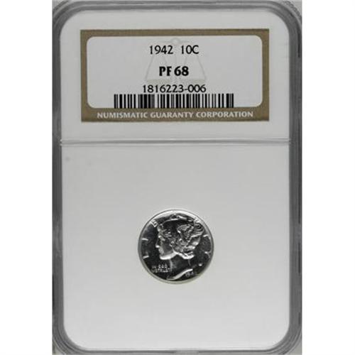 <B>1942 10C PR68 NGC.</B></I> Both sides of this PR68 are fully brilliant, and were subjected to a powerful strike that emboldens the design elements. Near-pristine surfaces add to the coin's eye appeal. Census: 82 in 68, 1 finer (6/07).<BR><BR><B>Coin Engraver:</B> Adolph A. Weinman<BR><BR><b>Shipping:</b> Coins & Currency (<a target="_blank" href="http://www.heritageauctions.com/common/shipping.php">view shipping information</a>\)