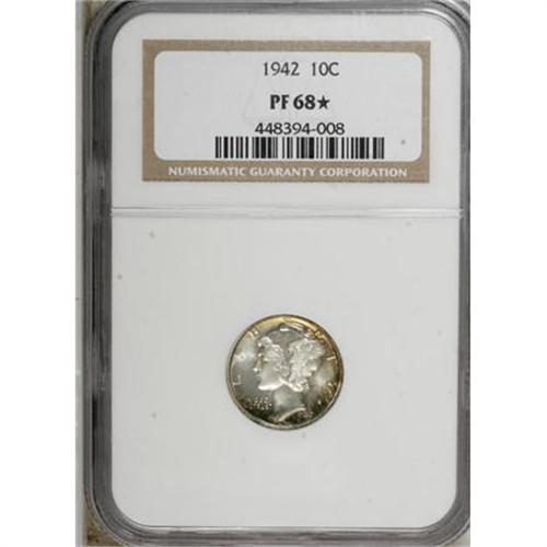 <B>1942 10C PR68 </B></I><img src="/images/star.gif" width="10" height="10" alt="" border="0"><B> NGC.</B></I> Wisps of golden-orange patina visit the obverse periphery, leaving the reverse untoned. Sharply struck and immaculately preserved.<BR><BR><B>Coin Engraver:</B> Adolph A. Weinman<BR><BR><b>Shipping:</b> Coins & Currency (<a target="_blank" href="http://www.heritageauctions.com/common/shipping.php">view shipping information</a>)